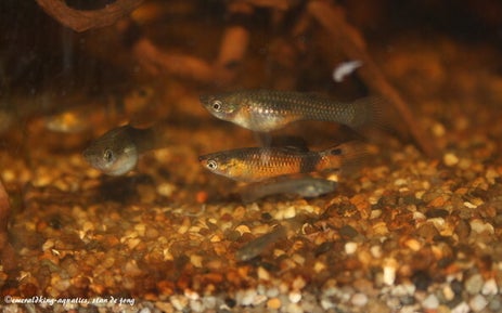 The female Micropoecilia picta looks a bit similar to a female guppy but actually it's got a slimmer body shape. Further on, the dorsal fin is situated a bit more backwards in comparison to a female guppy. Some have a peacock on their shoulders.