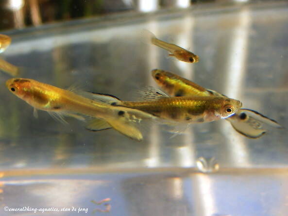 The idea was to create a yellow-golden endler hybrid with a lack of black pattern. But some accents should be present on the endler hybrid. The male's got a yellow body with an orange line on the shoulder and a very thin line on top of the body from head till tail. The female is translucent golden.