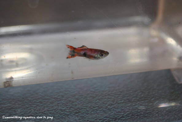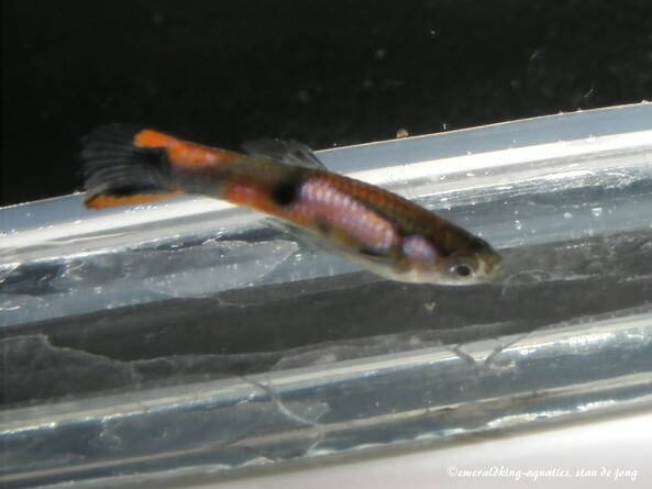 The red double swords were already there at that stage. And so was the silvery shouder and head. But phenotypically in shape it was still more a guppy breeding form than the bodyshape of an endler. So, my next step was to refine it all. This was succeeded in early 2024. The males were smaller and had better red swords. Males start off with developing white spots on the outer caudal fin rays which are slowly covered by red swords. The dorsal is completely black and is steady inherited by the moscow gene. Also the green that the rough version of the males had has disappeared. The green came from the Vienna emerald DS guppy influence.