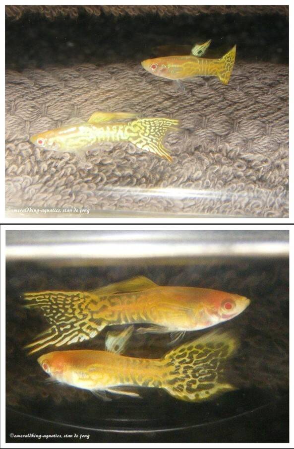 A strain of snakeskin hybrids with a blonde base was realized this year (2012) as well. These blonde snakeskins are the results of intercrossing a male snakeskin endler x a female flare (blonde) endler. First results was a whole bunch of regular flare endlers and just one male blonde snakeskin. This male was used to cross with certain sisters and about 40% was regular flare endlers (recognizable males) the other part (of the males) were blonde snakeskins. Now, the new offspring of all the blonde snakeskin males and their sisters are blonde snakeskins.