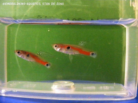 After the first batch of fry that was born out of these wild caught fish, all the male ofspring got the same colors as the fathers but there are three types of males: short tail, short topsword and short double sword. They all start coloring blue and secondly the red will develop on the body and slowly covers most of the blue on the body. And all males have this peacock in the caudal penducle.