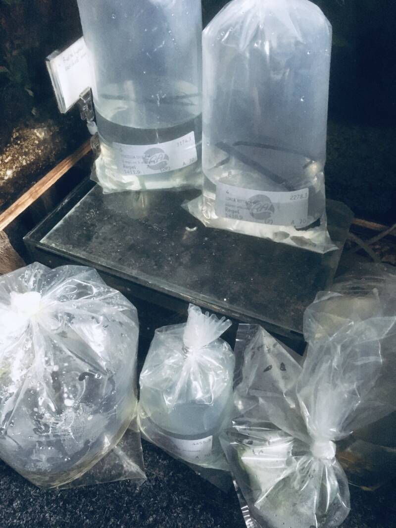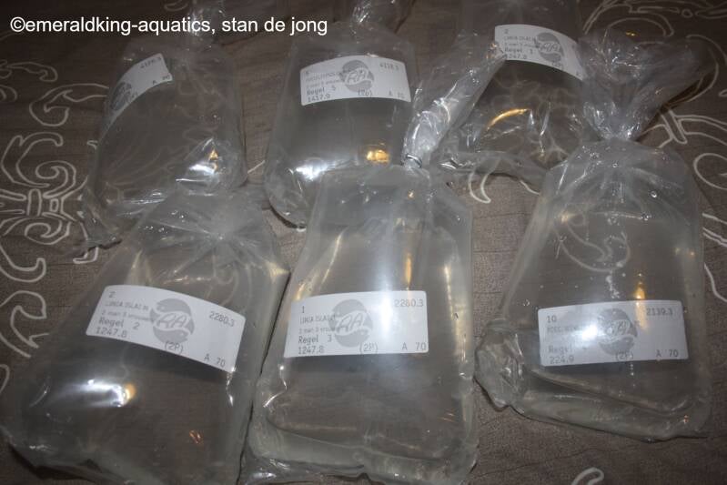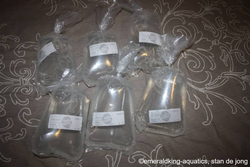 Another way of packing fish for shipping is in regular fish bags. But if I look at the regulations in my own country, we need to bag those fish twice. So, two bags in case the inner bag may leak for some reason. And it also insulates a bit. In these bags should be ⅓ water and ⅔ air according to the regulations. Just like the double bagged fish in the pics below: