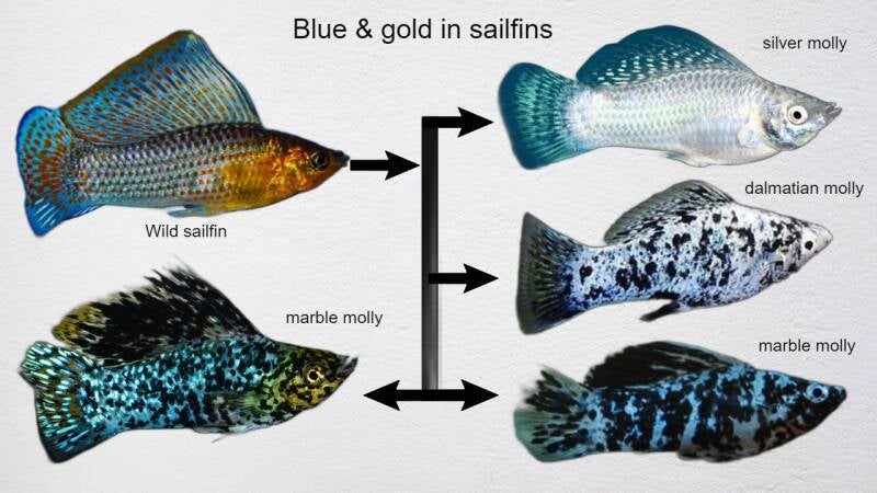 For instance, it's often seen in sailfin mollies that blue or a golden color can be seen under the yellow, white, orange, green, red and black base color. And in one it can be noticed more than in the other specimen. Well, know that both blue and gold actually already exist in wild specimens. The blue can come through very well on certain white specimens. With a white or gray base color in a sailfin molly which belong to the so-called spotted or mottled (with spots, large or small or not) phenotypes, we call the it a dalmatian molly. And otherwise the name changes into "marble" if the spots are larger and look like an all dark specimen. However, with this species it is questionable whether they remain dalmatian or not. Because with age, these spots can grow into very large spots where the body can appear almost completely black. You can also see this happening in wild specimens. Nevertheless, you will often discover a few pieces of blue or / and sometimes pieces of gold color with this type of sailfin molly. It's something that can be traced back to the wild form. Whether this also has to do with, for instance, certain water parameters that make certain color cells (which also occur in the wild) become stronger is not clear. However, it is known that the values of water parameters can influence the intensification of colors. And of course it also depends on the presence and density of the chromatophores (color cells) in the three skin layers of a fish. Nevertheless, the question remains how certain wild traits can still manifest themselves in breeding forms that are already far related from their wild ancestors for decades.