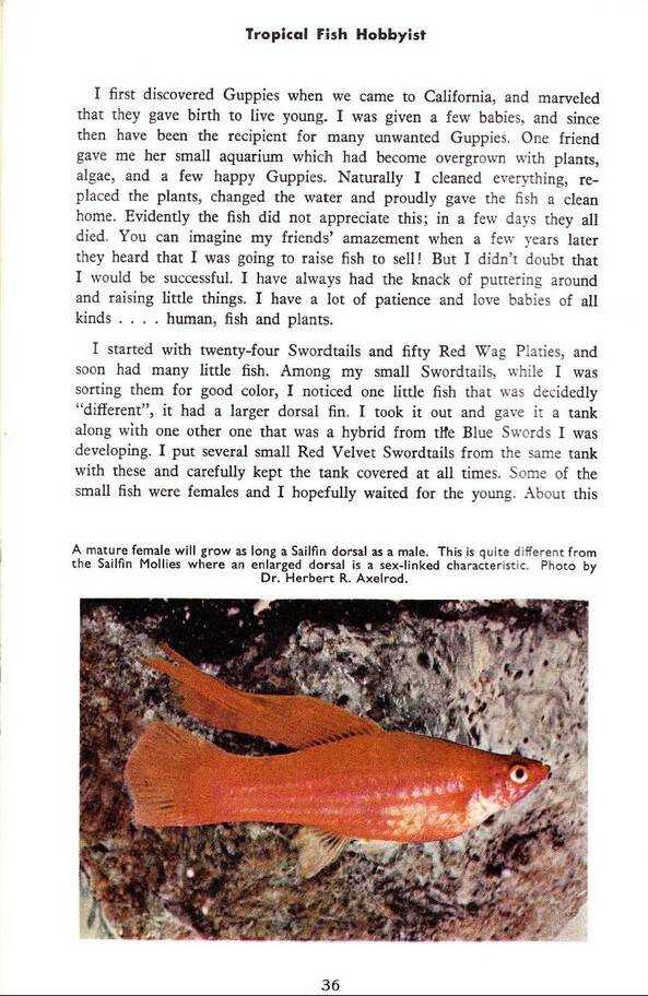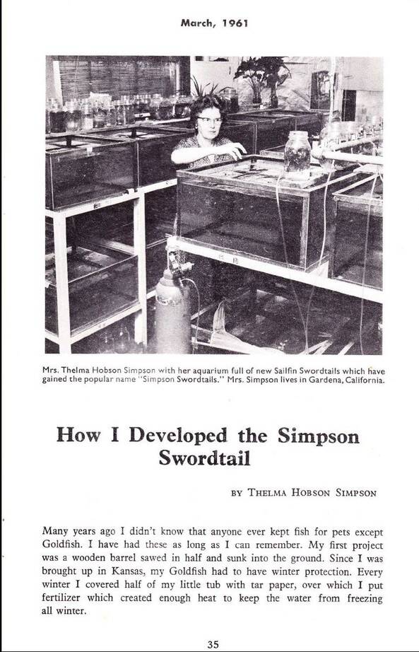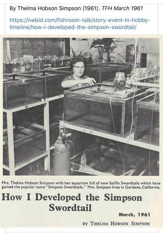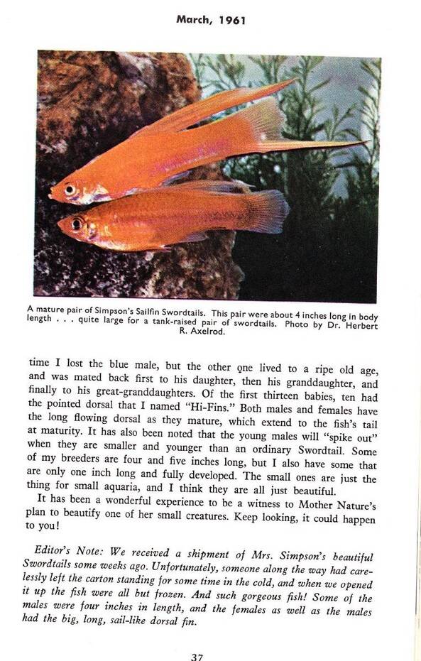 Just like the cauliflower swordtail, there are multiple fancy swordtail strains with a high or large dorsal. This so-called Hifin (or Hi-Fin) swordtail was firstly developed in the beginning of the 1960's. Thelma Hobson Simpson was a pionier within this field. These Hifins were called Simpson swordtails, named after Thelma Hobson Simpson.