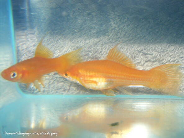 The males will develop a yellow-orange coloration in the dorsal and caudal.