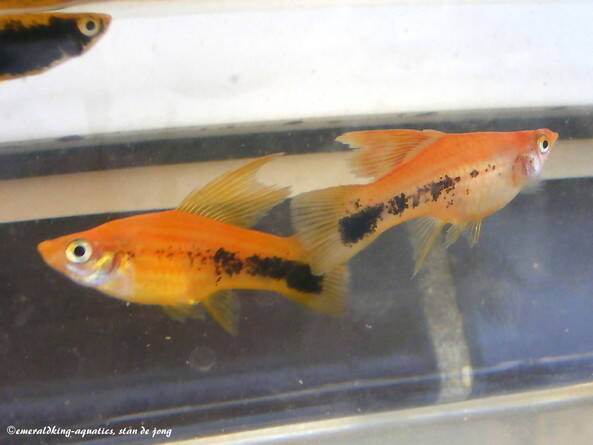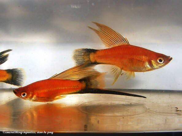 I'd like to reply on the frequent shown question at forums, which is: Are all fancy swordtails the result of a crossbreeding between swordtail and platy? The answer is: No! I do understand why people think that. For there are so many fancy platy strains that have the same coloration and/or pattern as many fancy swordtail strains. Most of them are a crossbreeding between platy and swordtail. But there are also fancy strains (specifically in the early years of fancy swordtails) that only have swordtail blood in them.