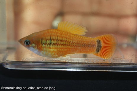 As adults they show a yellowish-light orange color on their bodies. But they start off as being grey bodied. The yellowish coloration shows up pretty fast. And they all show a strong scale pattern and a crescent mark at the start of the caudal penducle. And a number of lateral lines (differs between 1-3) on both sidesof the body are present. Despite of the typical shape of a variatus platy, they can develop a strong body shape as adults.